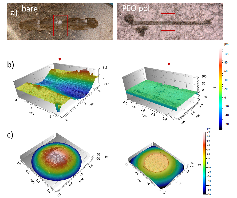 Abbildung: resultierende Oberflächen nach dem Trockengleiten von WC gegen die Legierung 229, a) Makroaufnahmen von blanken und polierten PEO-Oberflächen nach dem Trockengleiten, b) topografische Mikroaufnahmen der Mitte der Gleitspuren, c) Oberflächen von WC-Kugeln nach Gleitversuchen.