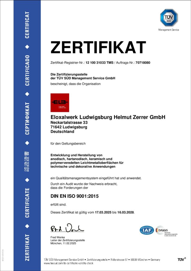 Das Qualitätsmanagement im Hause ELB ist mehrfach zertifiziert – zuletzt nach DIN EN ISO 9001:2015 – und entspricht den höchsten An­forderungs­kriterien.